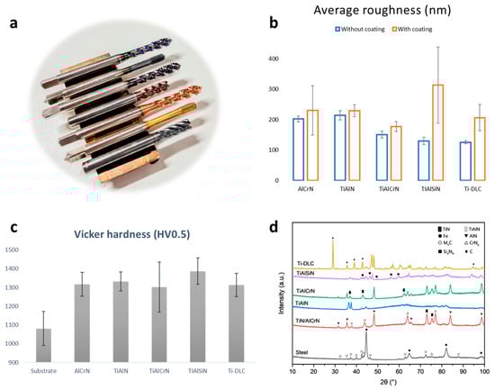 (a) Photograph of samples coated with various coatings. (b) Surface roughness, (c) microhardness measurements, and (d) XRD patterns of HSS substrate, TiN/AlCrN, TiAlN, TiAlCrN, TiAlSiN, and Ti-DLC coating on complex tool samples.