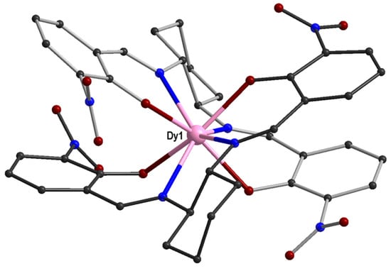 The molecular structure of one of the independent [DyIII(L4RR)2]− anions in 1R, CCDC-1424808 [32]. Color code: Dy pink, O red, N blue, C grey. The ligand in the front is shown with darker grey bonds for clarity purposes.