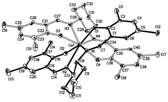 The CeIV ion in complex [CeIV(L7RR)2] (5R) is eight-coordinated to the two Ophenoxo and the two Nimino atoms from two (L7RR)2− ligands in distorted square antiprism geometry [34]. The dihedral angle between the best mean planes of the two ligands, excluding the C-atoms of the cyclohexane ring, is 47.1°, and this is a unique architecture for CeIV complexes with two Schiff base ligands (Figure 2). The Ce-O and Ce-N bond distances are 2.212(5)-2.241(5) Å and 2.550(7)-2.570(6) Å, respectively. The complex was studied by CD, 1H NMR, 13C NMR, and NOE (nuclear Overhauser effect) studies; the latter showed that the azomethine H-atom is in proximity to the phenyl ring H-atom and the cyclohexane CH2. The spectral analysis suggests CeIV ion in a distorted planarity of the N2O2 chromophore group.