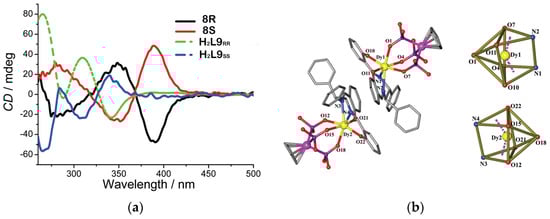 (a) CD spectra of 8R/8S and H2L9RR,SS in KBr pellets. (b) Partially labeled plot of the molecular structure of 8R and local coordination geometry of the DyIII ions; ethyl groups of the phosphates and H-atoms are omitted for clarity. Reproduced from Ref. [33] with permission from the Royal Society of Chemistry.