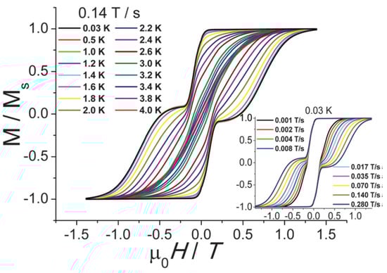 The hysteresis loops of 33R measured on a single crystal on a μ-SQUID at the indicated temperatures and field sweep rates. Reproduced from Ref. [43] with permission from the Royal Society of Chemistry.