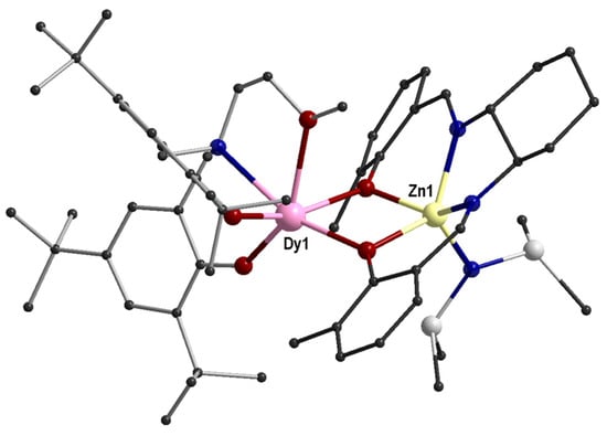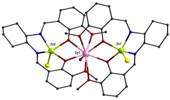 The molecular structure of one of the independent molecules in 34R, CCDC-2182147, [44]. Color code: Dy pink, Zn lime, Cl yellow, O red, N blue, C grey.