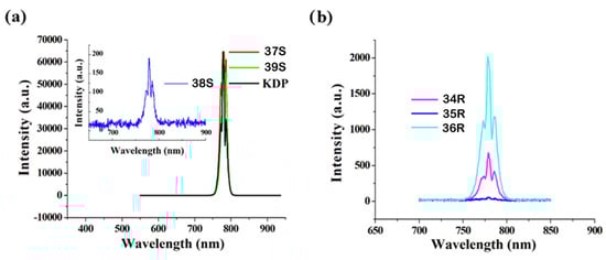 SHG spectra of crystalline samples of 37S-39S (a) and 34R-36R (b) with KH2PO4 (KDP) under excitation at λ = 1550 nm (Tint = 0.5 s). Reprinted with permission from Inorg. Chem. 2022, 61, 18510–18523 [44]. Copyright © 2022, American Chemical Society.