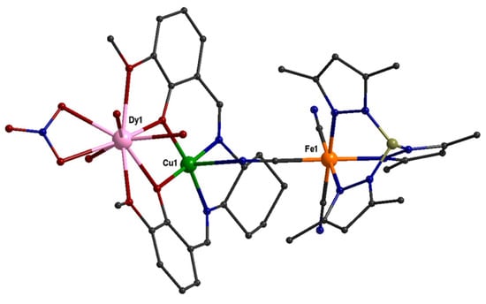 The molecular structure of the cation in 42R, CCDC-1537066, [45]. Color code: Dy pink, Cu green, Fe orange, B light grey, O red, N blue, C dark grey.