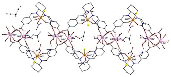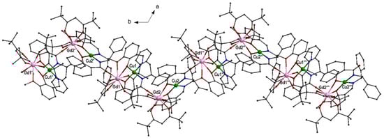 A chiral 1D coordination polymer [CuGd(L14SS)(thd)2]n (72S) was reported (Hthd = 2,2,6,6-tetramethyl-3,5-heptanedione), Table 3, [56]. The ligand H2L14SS in shown in Scheme 2. The CuII ion is square planar and is coordinated to the (OphenoxoNimino)2 donor atoms of the ligand. This subunit acts as a metalloligand to the two GdIII ions, Gd(1) and Gd(2). The two Ophenoxo and the one Omethoxo atoms coordinate at one side of the GdIII ion as a tridentate ligand. The Oamido coordinates with another GdIII ion as a monodentate ligand. The eight-coordination of each GdIII ion is completed by two bidentate thd− ligands (Figure 18). The chiral 1D chains extend along the b axis. The magnetic studies revealed ferromagnetic coupling between the metal ions, compatible with spin S = 4 in the ground state.
