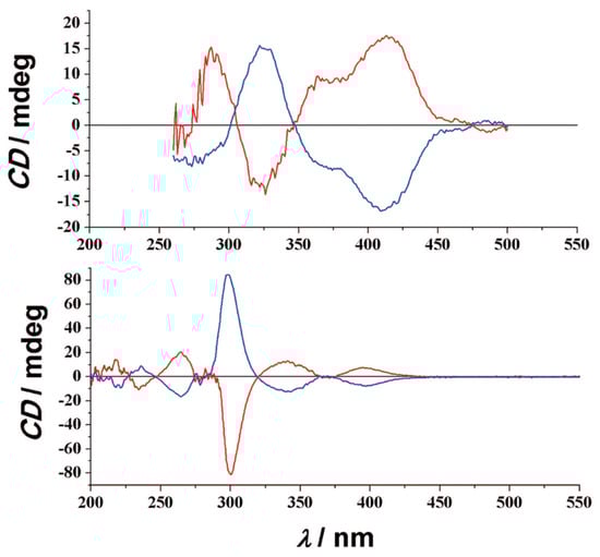 Solution CD spectra for the 56R/56S (top) and 62R/62S (bottom) pairs of enantiomers. R-enantiomers, red lines; S-enantiomers, blue lines. Reproduced from Ref. [50] with permission from the Royal Society of Chemistry.