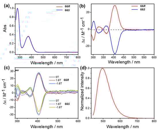 (a) UV–visible absorption spectra of 66R and 66S (298 K, DMF). (b) CD spectra of 66R and 66S (H = 0, +1.6, and −1.6 T) in the ranges of 270–600 nm at a concentration of 0.05 g L−1 (298 K, DMF). (c) CD spectra of 66R and 66S at 0.05 g L−1 (298 K, DMF). (d) PL spectra of 66R. Reproduced from Ref. [51] with permission from the Royal Society of Chemistry.