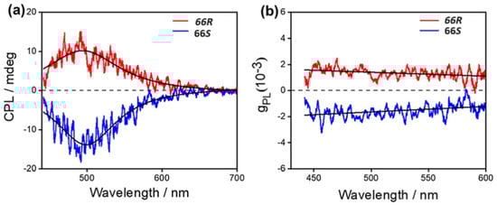 Optical properties of 66R/66S measured at room temperature. (a) Circularly polarized luminescence emission spectra. (b) gPL vs. wavelength curves. Reproduced from Ref. [51] with permission from the Royal Society of Chemistry.