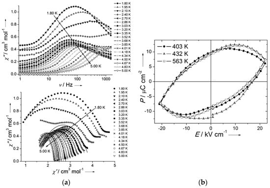 (a) Top: Frequency dependence of the out-of-phase (χ″) susceptibility at different temperatures performed under a 1.5 kOe dc field for 68R. Bottom: Cole-Cole plot for 68R obtained using the ac susceptibility data (1.5 kOe). The solid lines correspond to the best fit obtained with a generalized Debye model. (b) Dielectric hysteresis loop (1 Hz) for 68R obtained from a single crystal at different temperatures [53]. © 2015 WILEY-VCH Verlag GmbH & Co. KGaA, Weinheim.