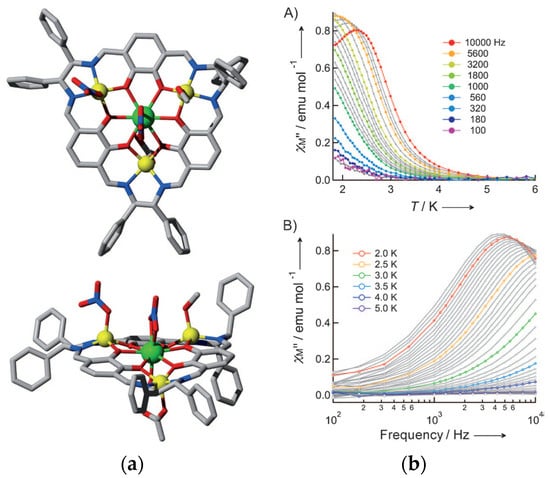 (a) Top view (top) and side view (bottom) of the molecular structure of 73R. Color code: Er gree, Zn yellow, O red, N blue, C light grey. (b) (A) Temperature and (B) frequency dependence of χM″ values of 73R measured under 1.0 kOe external field. The solid curves are guides for the eye [57]. Copyright © 2011 WILEY-VCH Verlag GmbH & Co. KGaA, Weinheim.