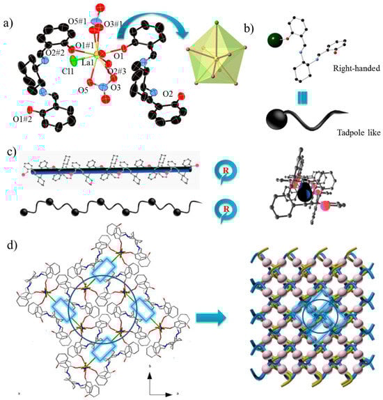 - Liu, C.-M.; Zhang, D.-Q.; Xiong, R.-G.; Hao, X.; Zhu, D.-B. A homochiral Zn-Dy heterometallic left-handed helical chain complex without chiral ligands: Anion-induced assembly and multifunctional integration. Chem. Commun. 2018, 54, 13379–13382. [Google Scholar] [CrossRef]