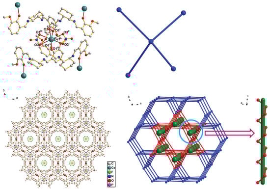 (top) The coordination environment of CeIII ion (left) and the simplified ball and stick model (right, the blue lines represent the salen type ligand) in the cation of 78 (H-atoms are omitted for clarity). Symmetry codes: (i) x, x − y + 1, −z + 3/2; (ii) −x, −x + y, -z + 3/2; (iii) −z, −y + 1, z. (bottom) 3D coordination structure of 78 along the c axis (left) and schematic illustration of quartz topology with the Schläfli symbol {64·82} along the c axis (right, the free PF6− ions are omitted for clarity). Reproduced from Ref. [61] with permission from the Royal Society of Chemistry.