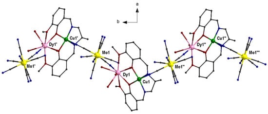 Part of the chiral zigzag chain of 81, CCDC-1060179, [58]. Color code: Dy pink, Mo yellow, Cu green, O red, N blue, C grey. Symmetry operations: (′) 1 − x, 0.5 + y, 1 − z; (″) 1 − x, −0.5 + y, 1 − z; (‴) x, −1 + y, z.