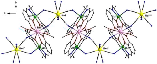 Part of the chiral zigzag chain of 86, CCDC-1060184, [58]. Color code: La pink, Mo yellow, Cu green, O red, N blue, C grey. Symmetry operations: (′) −x, −y, −z; (″) −x, y, 0.5 − z; (‴) −x, −y, 0.5 + z; (*) −x, −y, −0.5 + x; (**) −x, y, −0.5 + z; (***) x, y, −1 + z.