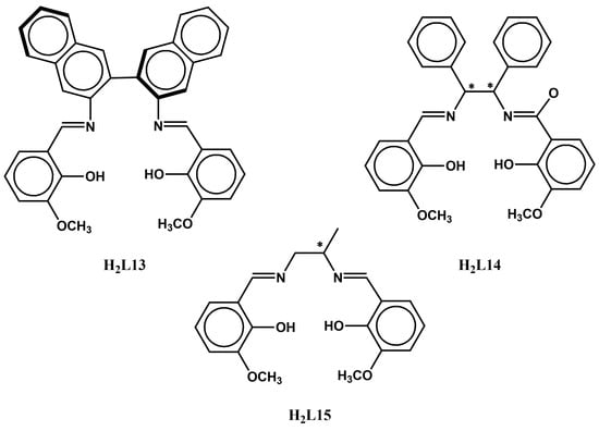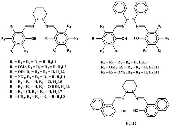 Lanthanide(III) ions display large spin ground states and magnetic anisotropy, therefore, have been widely used for the synthesis of homo- and hetero-metallic complexes which show single-molecule magnet (SMM) [20,21,22], and single-ion magnet (SIM) [23,24,25,26,27,28] behavior. Schiff bases are formed by the condensation reaction between a primary amine and an aldehyde or ketone. These compounds are widely used in organic synthesis and coordination chemistry as ligands for metal complexes. They are also important in the production of various pharmaceuticals, dyes, and pesticides, in the food and agrochemical industry, in catalysis and energy storage, and for environmental and biomedical applications [29,30,31]. Schiff base ligands can be easily synthesized by various combinations of carbonyl compounds and primary amines and can be easily functionalized by choosing starting materials with the desired side groups. The combination of chiral Schiff base ligands with lanthanide(III) ions has been an effective strategy for the development of multifunctional molecular materials. The present minireview summarizes the chiral 4f and 3d-4f coordination complexes with enantiopure Schiff base ligands derived from the condensation of aromatic aldehydes, such as salicylaldehyde and its various derivatives, and the enantiopure diamines, (1R,2R) or (1S,2S)-1,2-diamino-cyclohexane, (1R,2R) or (1S,2S)-1,2-diamino-1,2-diphenylethane, (R) or (S)-2,2′-diamino-1,1′-binaphthalene, and 1,2-diaminopropane. The complexes reported herein were published up to December 2023. The Schiff base ligands discussed herein are depicted in Scheme 1, Scheme 2 and Scheme 3.