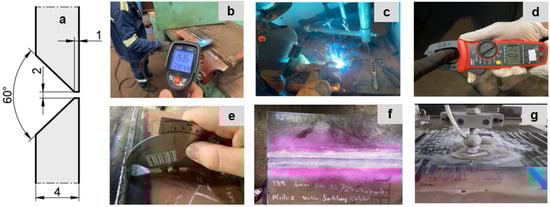 Preliminary preparation for welding and images taken during welding ((a). The groove size, (b). Thermal monitoring, (c). Welding process, (d). Measuring the welding voltage, (e). The weld cap height, (f). Penetrant test, (g). Specimen preparation process).