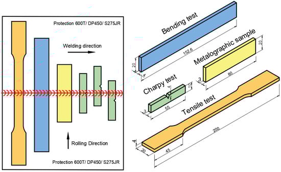 Figure 2 shows the dimensions of the samples used to determine the mechanical (tensile and bending, hardness, impact notch) and microstructural properties after the welding process. Hardness distribution in welded samples was conducted using the QNess 10 A+ brand micro-Vickers hardness tester by applying a 9.81 N pressure load for 15 s at 0.5 mm intervals, perpendicular to the weld line. To determine the impact energy, the impact absorption energy of the sample was measured using the JBN-300 pendulum testing machine, in accordance with the ISO 9016 standard [], including the weld line and heat affected zone (HAZ). To determine the strength of the welded samples, a 60-ton Zwick Roell brand tensile device was used at a speed of 2 mm/min at room temperature. Finally, the material internal structure was examined with an electron microscope (Nikon Epiphot 200 Inverted Metallurgical Microscope, Artisan Technology Group, Kansas City, MO, USA). Welding efficiency is calculated using the following formula [,].