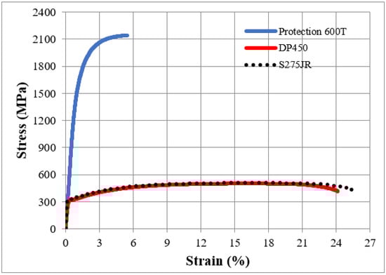 Post-welding stress–strain graphs of Protection 600T, DP450, and S275JR materials (those close to the average value were selected) are given in Figure 11, while post-welding UTS, percentage elongation values, and welding efficiency relative to the base material are given in Table 5. Post-welding UTS values of base materials were obtained as 1083.4 ± 3.99, 516.5 ± 11 and 507.3 ± 5.7 MPa, respectively. When welding strengths were evaluated according to efficiency, they were determined as 49.4%, 103.05%, and 99.76%, respectively. It was determined that the weld strength of Protection 600T decreased compared to the base material UTS. It is thought that this is due to the additional welding wire.