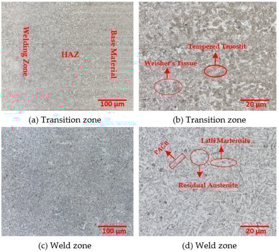 The microstructure of the HAZ and the weld zone of the Protection 600T material welded using ER70S-A1 wire is shown in Figure 5. Upon examination of the welded samples, it was determined that the transitions between the base material and the HAZ were homogeneous and smooth (Figure 5a). Although the base material has a densely tempered martensite structure, the HAZ was annealed at a medium temperature in its structure with the heat effect and tempered troostite, characterized by the gradual disappearance of the needle shape of the martensite, was observed (Figure 5b). When the microstructures shown in Figure 5c,d were examined, it was determined that the tempered martensite ratio was dominant in the weld metal, but in some parts of the martensite phase, there was a small amount of lath martensite phase aligned in parallel to form martensite beams or martensite areas. In addition, retained austenite and primary austenite grain boundaries and Weisher’s tissue were detected in the weld area (Figure 5d).