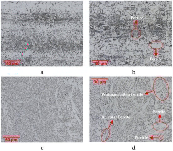 In Figure 7, microstructure images of the HAZ and weld zone of the S275JR/S275JR material pair are provided. In the HAZ, a microstructure consisting of ferrite and lamellar pearlite phase (Figure 7a,b), and in the weld zone, a microstructure dominated by ferrite content (Figure 7c,d), formed. In addition, with the effect of the additional wire in the weld zone, although pearlite and Widmanstatten ferrite were observed in some areas, in general, intense acicular ferrite formation was detected. In the zones under the influence of heat, a soft transition was observed, and the ferrite and pearlite phases were distributed homogeneously, creating a soft transition zone. While pearlite and ferrite phases were arranged in columns at the transition boundary from the HAZ to the weld zone, it was observed that the ferrite phases generally turned into acicular ferrite in the weld zone.