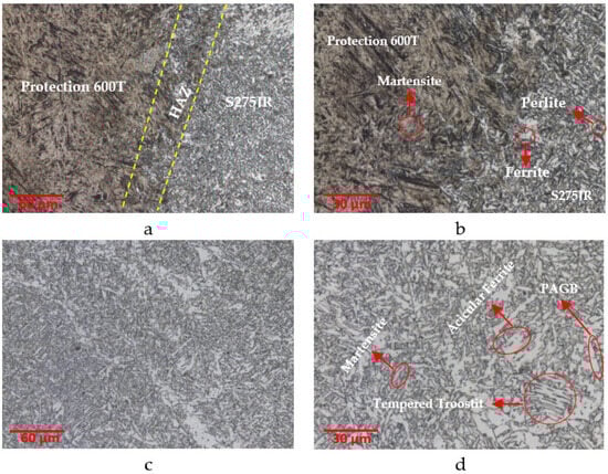 (a,b) HAZ (500×, 1000×), (c,d) weld zone microstructure images (500×, 1000×) for Protection 600T/S275JR material pair.