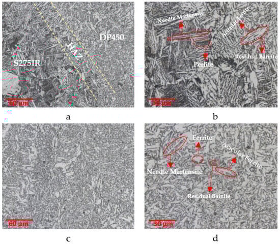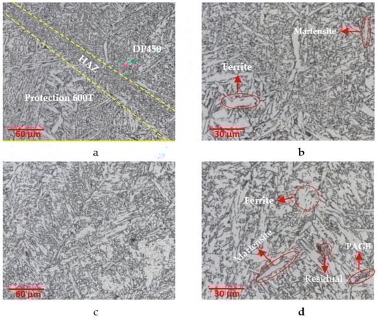 Figure 9 shows the microstructure images of the transition zone and welding zone of the DP450/Protection 600T material pair. Ferrite and martensite phases were observed in the HAZ (Figure 9a,b). In the region under the influence of heat, it has been determined that the martensite phase and ferrite phases were distributed homogeneously, and a smooth transition was observed. It was determined that ferrite and martensite were dominant in the weld zone, and residual austenite and occasionally primary austenite grain boundaries were observed (Figure 9c,d).