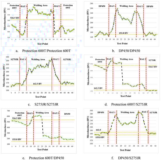 In hardness measurements, the hardness values of the base materials were determined as 526.5 HV for Protection 600T, 153.8 HV for DP450, and 162.5 HV for S275JR. In similar materials (Figure 11a–c), a decrease in hardness was observed as approaching HAZ, while an increase in hardness was identified in the weld zone due to the effect of the welding wire.