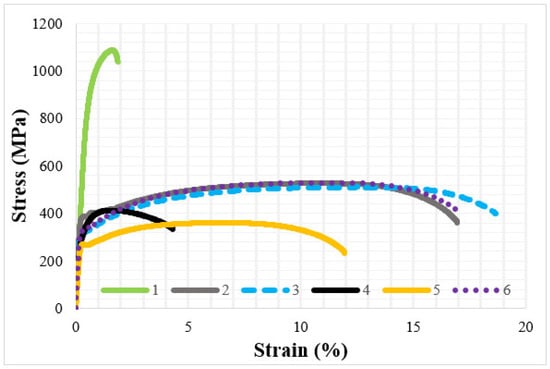 When Figure 12 is examined, it can be observed that the stress–strain diagram of welded samples (Protection 600T/Protection 600T, DP450/DP450, and S275JR/S275JR) is similar to that of the base material. The indicators given in Figure 12 correspond to the same materials as the sample numbers shown in Table 5. In the welding of dissimilar materials, the UTS values for Protection 600T/S275JR were determined to be 413.6 ± 1.6 Mpa, for Protection 600T/DP450 it was 360.6 ± 0.4 Mpa, and the percentage elongation values were determined to be 4.3% ± 0.17 and 5.3% ± 0.2, respectively. It is observed that the UTS and efficiency decreased when Protection 600T was welded with other materials.