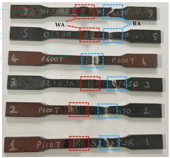Tensile rupture morphologies of the welded sample (Welding Area: WA, Rapture Area: RA).