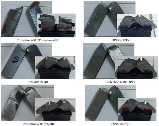 The fracture surfaces of the tensile test samples are given in Figure 13. It was observed that the fracture occurred as brittle fracture in the weld pairs with S275JR material. In the DP450/DP450 and Protection 600T/DP450 material pairs, the fracture was ductile and on the DP450 side. In DP450/S275JR, the breakage occurred on the DP450 material side. The rupture in the Protection 600 T/Protection 600 T welded joints occurred in the weld area. These data showed that the welded joints were made appropriately, and the rupture occurred where it was expected according to the strength of the base material.