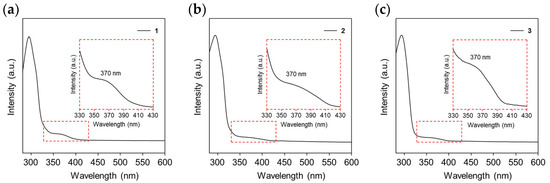 UV-vis spectra of (a) 1/iPrOH solution, (b) 2/EtOH solution and (c) 3/MeOH solution.
