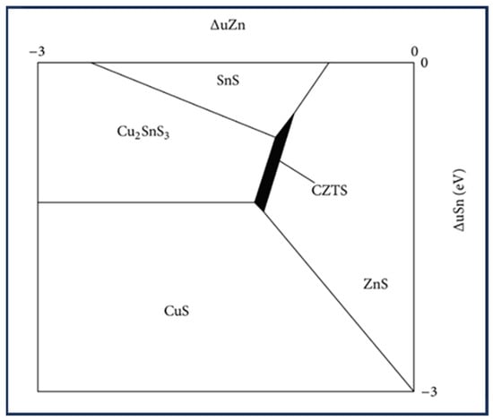 The coexistence of phases, such as ZnS/Se, CuxS/Se, SnSx/Sex, or Cu2SnS3/Se3 with the quaternary CZTS/Se phase in the solar absorber layer can drastically reduce the efficiency and performance of solar cells; therefore, the phase stability and control of defects formation are critical in processing CZTS materials [,,]. Phase equilibrium studies revealed that the single-phase stannite CZTS exist in a very small range of component deviation (1–2%) below 550 °C [,]. Understanding the nature of the defects is necessary to control the synthesis process toward less impurities and defects. Due to the narrow region of chemical potential between 1 eV and 0.1 eV that is favorable for the formation of the quaternary phase of CZTS, as shown in Figure 2, synthesizing single-phase kesterite poses significant challenges [,].