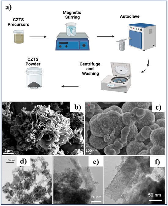 (a) Schematic diagram of hydrothermal synthesis of CZTS nanoparticles. Created by Biorender.com. (b) FE-SEM images of CZTS with hierarchical structure. Adapted from []. (c) SEM images of CZTS quantum dots synthesized by hydrothermal method. Adapted from []. (d) TEM of as-synthesized CZTS nanoparticles. Adapted from []. (e,f) High-magnification TEM image of the CZTS nanocrystals synthesized by hydrothermal method. (e) Spherical nanocrystals. (f) Rod-like nanocrystals. Adapted from [].