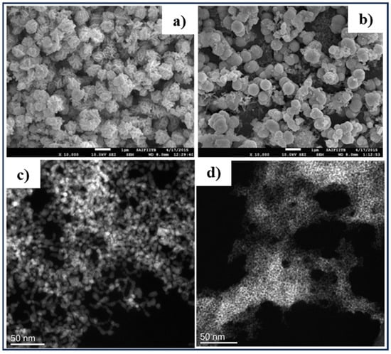(a,b) SEM images of CZTS nanoparticles synthesized by microwave-assisted solvothermal method, with (a) flower-like morphology of the sample with 2 mM precursor concentration, (b) sphere-like morphology of the sample with 10 mM precursor concentration. Adapted from [], (c,d) TEM analysis of CZTS nanoparticles synthesized by solvothermal method at 250 °C for 2 h with (c) from chloride precursors, and (d) from acetate precursors. Adapted from [].