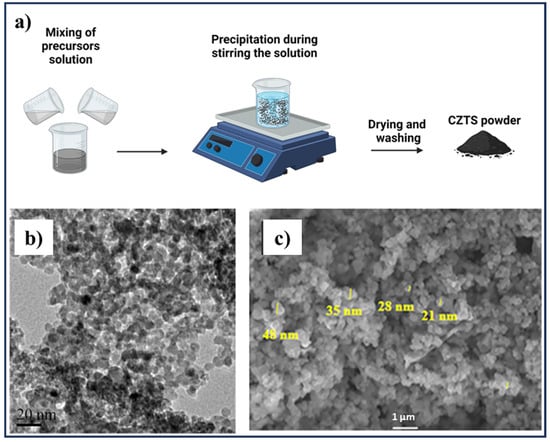 (a) Schematic of the co-precipitation method, created by Biorender.com, (b) TEM image of slightly irregular and poly-dispersed of CZTS nanocrystals with average size of 10 nm synthesized by co-precipitation method. Adapted from [], (c) SEM image of a sample synthesized by co-precipitation method using thiourea as a sulfur source. Adapted from [].
