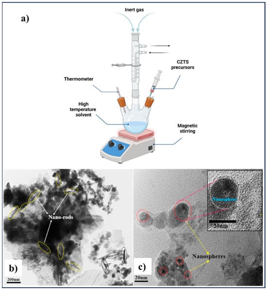 The hot-injection method was first used to synthesize cadmium chalcogenide nanocrystals in 1993, and was followed by the application of this technique to the synthesis of other types of nanocrystals, including metal oxides and semiconductors [,]. As evident from its name, hot-injection process reactions occur in the liquid phase by injecting precursor solutions into another solution of precursors or in a solvent that is kept at an elavated temperature, typically over 250 °C (Figure 8a). CZTS nanocrystals prepared by the hot-injection method are popular in solution processable solar cell technology since their desirable chemical and physical properties make them ideal for thin film deposition using dip-coating, inkjet printing, spraying, or roll-to-roll coating under ambient conditions [,]. This method can enable the cheap and scalable fabrication of uniform nanoparticle thin films for solar cells, and allows controlled composition, phase formation, and uniform morphology []. Cao et al. demonstrated the use of a novel solution processed synthesis approach to obtain CZTS and CZTSSe thin films offering easy control over the metal ratios. The precursors are binary and ternary Cu, Zn, and Sn sulfide nanoparticles, in various combinations, for example, ZnS combined with Cu2SnS3, at stoichiometric ratios, to create the thin film precursor layer, which is then converted to CZTSSe through annealing in the presence of selenium. Solar cell devices fabricated with this method exhibited a high PCE of 8.5%. Further optimization focuses on refining the metal and S/Se ratios, controlling the bilayer formation, and improving the back contact for enhanced device performance []. Semalty et al. prepared CZTS nanoparticles with a size of 2–5 nm through the colloidal hot-injection method by using different ligands for the application of the photocatalytic degradation of hazardous water pollutants. In that report, single-phase kesterite structured CZTS was synthesized from copper (II) chloride dihydrate, zinc (II) chloride, tin (IV) chloride, and S powder as precursors. Copper, zinc, and tin precursors were added to a two-neck round bottom flask with Trioctylphosphine oxide (TOPO) in temperatures between 250 and 300 ºC for an hour. After changing the color from yellow to orange, elemental S with Trioctylphosphine (TOP) was rapidly injected into the flask and maintained at a temperature of 230 ºC for 20 min; the pale brown color was seen, and after heating it up to 250 °C, a deep black color was obtained. TEM charactrization of as-synthesized CZTS nanoparticles revealed the agglomerated nanorods (120–140 nm) with a fringe width of 0.23 nm for that sample which was synthesized using TOPO and TOP as the ligands (Figure 8b), and nano spherical morphology (diameter of 15–35 nm) with a fringe width of 0.2–0.4 nm for the sample with n-butylamine and octadecene as ligands (Figure 8c) [].