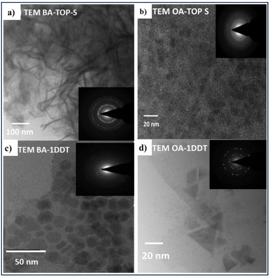 TEM images and corresponding SAED patterns of CZTS nanoparticles with (a) BA as capping ligand and TOP-S as sulfur source, (b) OA as capping ligand and TOP-S as sulfur source, (c) BA as capping ligand and 1-DDT as sulfur source, (d) OA as capping ligand and 1-DDT as sulfur source. Adapted from [].