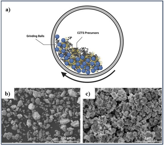 (a) Schematic of the mechanical alloying process, created by Biorender.com (b) FEG-SEM, and (c) FEG-TEM of synthesized CZTS powders at 250 °C for 1 h. Adapted from [].