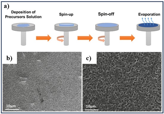 (a) Steps of spin-coating method, (b) SEM images of non-stoichiometric CZTS films coated at spinning speeds of 3200 rpm, (c) stoichiometric CZTS films coated at spinning speeds of 3200 rpm. Adapted from [].