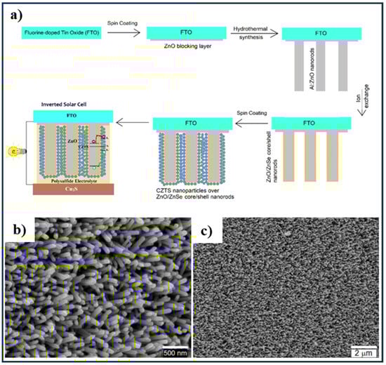 (a) Flow diagram for the fabrication process of CZTS sensitized ZnO/ZnSe core/shell nanorods arrays and their application in liquid junction solar cells, (b,c) FE-SEM of: (b) Al:ZnO nanorods, (c) Al:ZnO/ZnS core/shell nanostructures. Adapted from [].