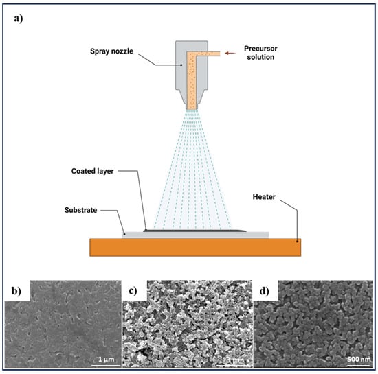 (a) Schematic of the spray pyrolysis method, created by Biorender.com, (b–d) SEM surface images of CZTS thin films fabricated by spray technique on substrate with annealing temperature of (b) 250 °C, (c) 300 °C, and (d) 350 °C. Adapted from [].