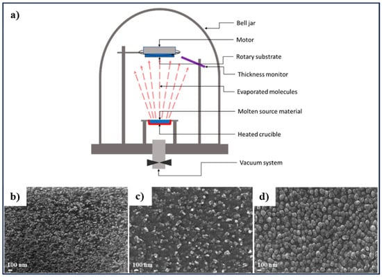 In this method, which enables nanoscale thickness coatings, the source material is heated to a high temperature within a vacuum, causing it to evaporate and vapors directly reach a low-temperature substrate where they solidify and form a thin layer [,]. In this method, resistive heating is commonly used for thin film deposition, and the source materials are in the form of powder or solid bar, evaporated by a heated filament or boat []. Since the target and the substrate have a significant temperature difference, a temperature gradient forms which leads to a vapor stream that flows from the target to the surface of substrates. As the atoms or molecules hit the surface, they condense back into a solid state (Figure 16a) []. Since resistive heating cannot melt materials having a high-melting point, another form of physical vapor deposition method, i.e., electron beam deposition, is used []. Sripan et al. studied the effect of sulfurization and annealing on various phase changes and on the light-harvesting capability of CZTS absorber layers fabricated by the thermal evaporation method on substrate when using single-source materials which was synthesized by molten technique []. It was reported that as-deposited CZTS film contains a Sn2S3 secondary phase, while for the films annealed at 450 °C and 500 °C, and sulfurized at 550 °C, no unwanted secondary phases were detected []. CZTS films were grown using a thermal evaporation technique onto non-heated substrates by Khemiri et al. to study the effect of different annealing atmosphere, i.e., (a) vacuum annealing atmosphere, and (b) sulfur annealing atmosphere followed by vacuum annealing on the properties of CZTS film []. Figure 16b–d revealed a different surface morphology of the CZTS thin film where the deposited sample (Figure 16b) exhibited a flat and smooth surface morphology with negligible grains, due to the amorphous nature of the film. After annealing, the surface morphology changed to a non-uniform surface with sparsely distributed grains, whereas the sample annealed under sulfur atmosphere followed by vacuum annealing exhibited a homogeneous and compact surface with densely packed grains. The most adequate properties fulfilling the requirements of the absorber layer were reported for the second annealing condition []. In another study, CZTS thin film was obtained by thermal evaporation method using pure phase CZTS nano-structured bulk material, prepared using a solution method with water, ethylene glycol, and ethylenediamine as solvents. The formation of polycrystalline CZTS thin film with a tetragonal crystal structure after annealing at 450 °C having a direct bandgap of ~1.36 eV was reported [].