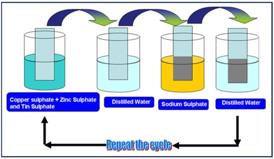 The successive ionic layer adsorption and reaction (SILAR) method uses a chemical approach for creating large, uniform thin films, and involves submerging the substrate into separate cation and anion solutions. Figure 18 shows the detailed schematic of the SILAR method. This technique has been effectively used for various materials like metal sulfides, selenides, tellurides, and oxides. SILAR stands out among other film deposition methods due to its low temperature requirement, use of aqueous solutions, layer-by-layer growth, and distinct sources for anions and cations. The SILAR method was first used by Mali et al. to deposit CZTS thin films onto the FTO substrates. CuSO4, ZnSO4, and SnSO4 solutions were dissolved in H2O giving Cu2+, Zn2+, Sn2+ anions, while Na2S was dissolved in H2O giving S2− cations, and the CZTS uniform thin film consisting of particles with an average grain size of 100 nm was achieved by the sequential immersion of substrate in cationic and anionic solutions. Rinsing in deionized water was applied after every immersion []. Krishnan et al. synthesized CZTS thin films using a single cationic bath by a modified SILAR route, with a separate bath for Zn2+ ions to avoid the formation of Cu3SnS4 (CTS) and Cu2S phases rather than phase pure CZTS, the process was followed by annealing at elevated temperature []. Murugan et al. prepared nano-crystalline CZTS thin films on the conducting and nonconducting substrates by SILAR method for different dipping times. The bandgap of the obtained films was reported in the range of 1.46–1.82 eV []. Kumar et al. investigated the effect of Ar annealing on the physical properties of CZTS thin films, deposited by the SILAR process in various precursor concentrations, dipping times, and numbers of cycles. It was reported that the surface of the as-deposited film contains a few voids and cracks which were decreased by annealing films at 250 °C for 1 h, in an Ar atmosphere, resulting in achieving a thin film with higher density [].