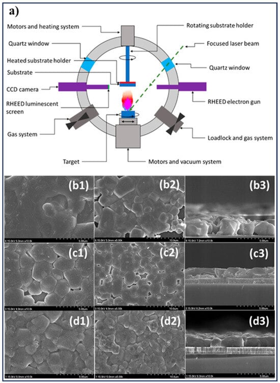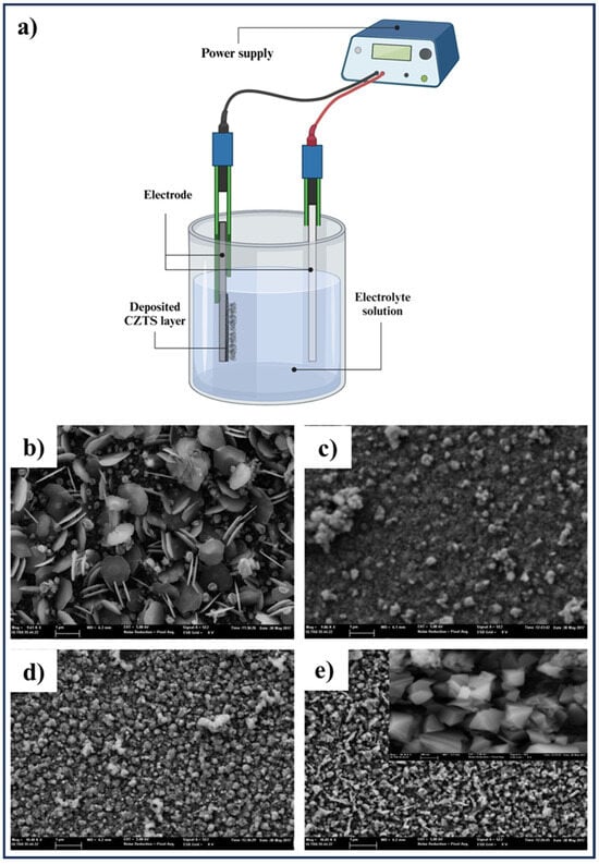 (a) Schematic of the electron beam evaporation method. Adapted from [], (b–e) FE-SEM images of CZTS thin films deposited by electron beam evaporation method on substrate at (b) 220 °C, (c) 250 °C, (d) 280 °C, and (e) 310 °C. Adapted from [].