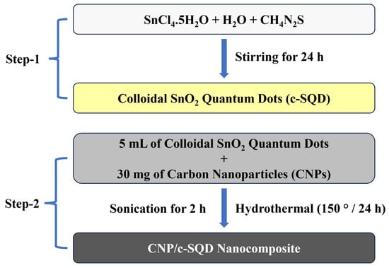 Conductive carbon nanoparticles were synthesized from glucose through a hydrothermal method following established protocol [26] and functionalized with nitric acid [27]. The preparation of colloidal SnO2 quantum dots proceeded as follows: initially, 0.3 g of thiourea (CH4N2S) and 0.9 g of tin chloride dihydrate (SnCl2·2H2O) were dispersed thoroughly in 30 mL of water. Subsequently, the resulting white solution was stirred at room temperature for 24 h, yielding a yellow solution containing colloidal SnO2 quantum dots. The nanocomposite of carbon nanoparticle–colloidal SnO2 quantum dots (CNP/c-SQD) was synthesized using a sonochemical approach. Specifically, 30 mg of carbon nanoparticles were dispersed in 40 mL of ethanol for 15 min. Then, 5 mL of c-SQDs were added dropwise to the CNP solution under stirring, followed by continued stirring for an additional 5 min. The mixture was subjected to probe sonication for 2 h and subsequently transferred to a 100 mL hydrothermal autoclave, which was placed in an oven at 150 degrees Celsius for 24 h (Figure 1).