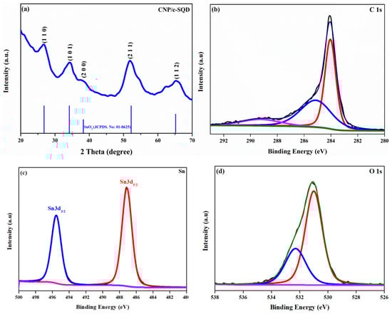 (a) XRD of the CNP/c-SQD nanocomposite and (b–d) high-level XPS spectra of C, Sn and O, respectively.