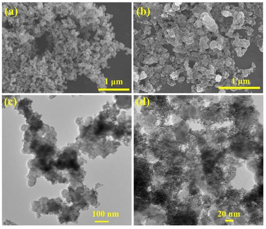 Figure 3 provides a comprehensive series of images capturing the morphological nuances of pristine carbon nanoparticles (CNPs) and their nanocomposite with colloidal SnO₂ quantum dots (c-SQDs). The analysis of these images reveals key structural features significant for the nanocomposite’s potential applications. Panel (a) of Figure 3 shows a scanning electron microscopy (SEM) image of pristine CNPs. The particles are characterized by an interconnected structure, which could be indicative of a high surface area conducive to enhanced interaction with c-SQDs. The smooth surface morphology seen in the pristine CNPs suggests a relatively defect-free structure that could facilitate uniform coverage by the c-SQDs. Panels (b) through (d) transition from SEM to transmission electron microscopy (TEM) images of the CNP/c-SQD nanocomposite, revealing a progression toward finer detail. In (b), the SEM image of the nanocomposite displays a core–shell-like structure, where the CNPs appear to serve as the core upon which the c-SQDs are anchored. This is due to the c-SQDs’ extremely small size and colloidal nature, allowing them to fully attach and possibly envelop the CNPs [33]. This intimate connection suggests a strong interaction between the two components, which could enhance the nanocomposite’s electrical and catalytic properties. The TEM images in (c) and (d) offer a more detailed examination, highlighting the ultra-small size of the c-SQDs and their pervasive distribution across the CNPs. The near-continuous coverage observed may lead to a synergistic effect, whereby the CNPs provide a conductive scaffold enhancing electron transfer, and the c-SQDs contribute to the active surface, possibly affecting the photocatalytic or electrochemical performance of the nanocomposite. This core–shell configuration could be particularly advantageous for applications requiring a high interface area between the conductive core and the active shell in energy storage systems [34]. Moreover, the morphological characteristics depicted, including the homogeneity and extent of the c-SQDs’ attachment to the CNPs, are crucial for the functional performance of the nanocomposite. Overall, the morphology elucidated by Figure 3 paints a picture of a well-engineered nanocomposite material with a potential for high performance in its intended applications, thanks to the intricate architecture of CNPs and c-SQDs. The nanoscale organization, as visualized in these images, underscores the advanced level of material synthesis and the potential for tailored functionalities in the CNP/c-SQD system.