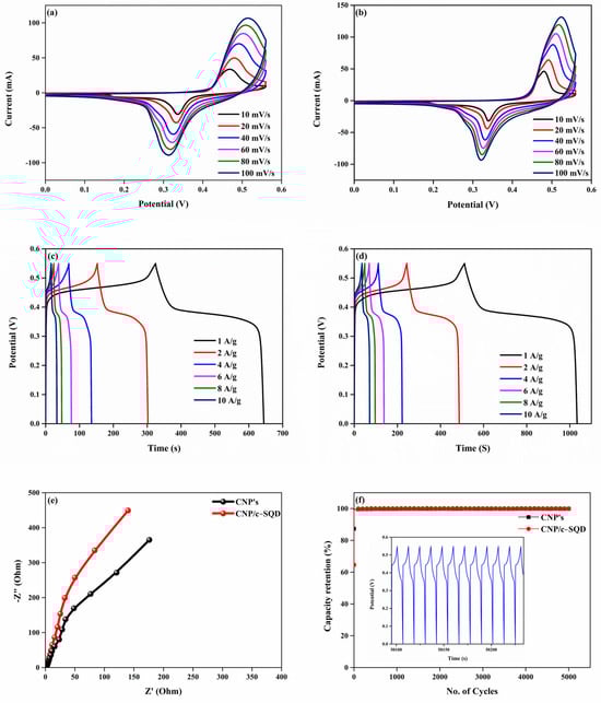 CV plot of CNPs (a) and CNP/c-SQD (b); GCD profiles of CNPs (c) and CNP/c-SQD (d); EIS (e) and capacity retention vs. number of cycles (f) of CNPs and the CNP/c-SQD nanocomposite.