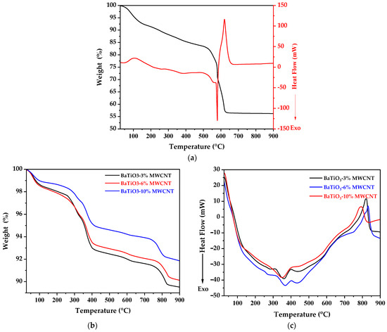 Figure 1. (a) Thermogravimetric analysis and differential scanning calorimetry of (a) pure BaTiO3 and (b,c) BaTiO3/MWCNT nanocomposites.