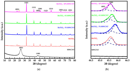 The Rietveld refinement results indicate that the addition of 3% of MWCNT reduces the crystallite size of BaTiO3 from 83.27 to 57.71 nm, compared to pure BaTiO3. However, increasing the amount of MWCNT increases the crystallite size of BaTiO3 from 73.1 to 78.26 nm for 6 and 10% MWCNT, respectively. This effect can be appreciated in Figure 2b with the shift of the BaTiO3 peak from the center to the right side with the addition of 3% of MWCNT, and to the left side with increasing amounts of MWCNT. This result also shows that the peak located at 45.5° is composed of two peaks corresponding to the (002) and (200) reflection planes, which are indicative of the tetragonal crystal system [47].